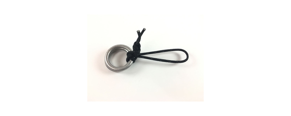 The rings are held against one another at one end, a loop with a cow hitch works well. Then at the other end, the cord to be adjusted simply loops around both rings once and then a second time around just one ring.
